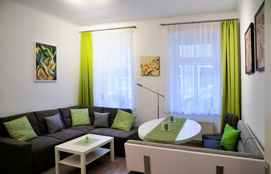 Wohnzimmer mit Schlafcouch und großem Esstisch